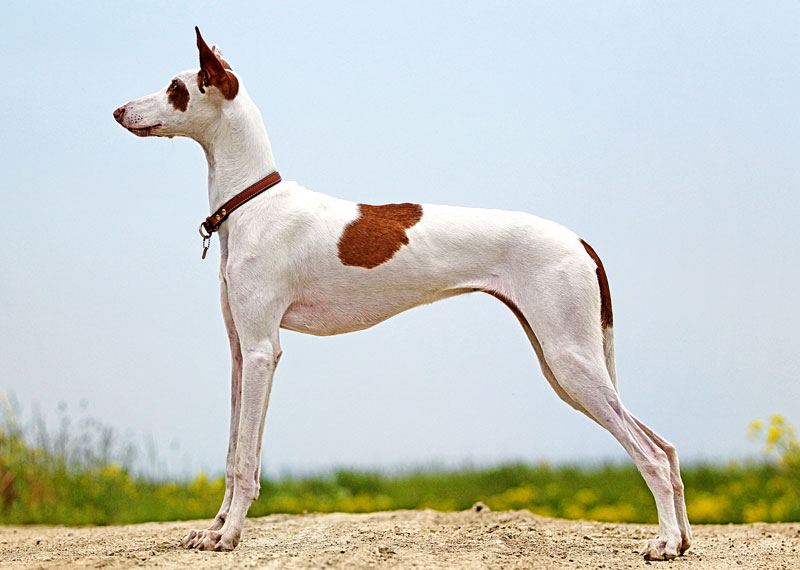 The trial is qualified as having 5 parts. The dogs should show: (1) careful tracking and scenting of the rabbit, without being distracted in the least, 0-30 points; (2) correct signalling of the game, patient stand, strong jump into the air, obedience 0-10 points; (3) chase, giving tongue, speed, sureness, anticipation 0-30 points; (4) putting the game to cover at close quarters, listening, waiting, obedience, correct attack 0-10 point; and (5) good catch or correct indication of the game’s location, retrieval, obedience 0-20 points.Individual dogs are expected to show a great degree of discipline, obedience and co-operation. They should be extremely agile, have good speed and a powerful vertical jump from a stationary position in rough and often heavily covered ground. They should have excellent scent-tracking abilities, give tongue at the right time when approaching the game closely, and otherwise be silent so that they can locate the game by sound. The Ibizan Hound is similar in function and type to several breeds, such as the Pharaoh Hound, the Cirneco dell’Etna, the Portuguese Podengo, and the Podenco Canario. The Ibizan Hound is the largest of these breeds, classified by the Fédération Cynologique Internationale as primitive types.This breed is considered by most experts one of the most ancient dog breeds. It is believed the Ibizan Hound evolves from the tesem, the ancient Egyptian hunting dog. Representations of this dog on the walls of ancient tombs show a striking similarity to the modern Ibizan Hound. These dogs would have been brought to the island of Eivissa by the Phoenicians, who founded settlements there as early as the 8th century BC. A recent DNA analysis